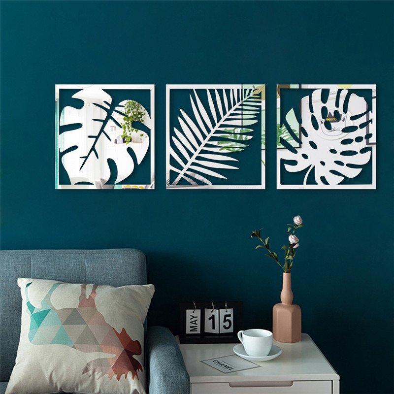 3 Pc Set Hollow Photo Frame Palm Leaves Acrylic Mirror Wall Stickers (Silver)