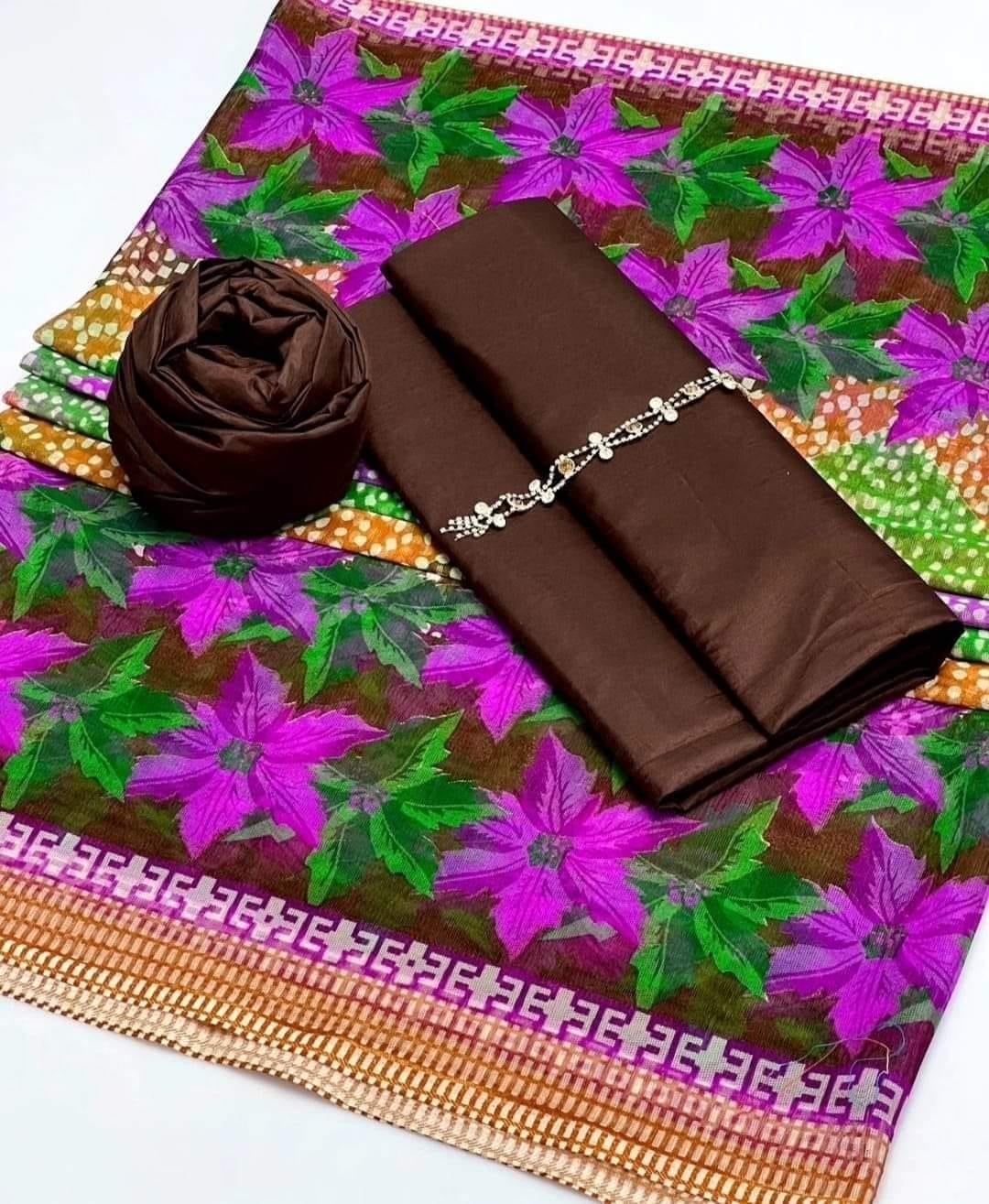 Qattan silk shirt and trouser Neckline Net floral print dupata Suit 4 yards Dupata 2.5 yards