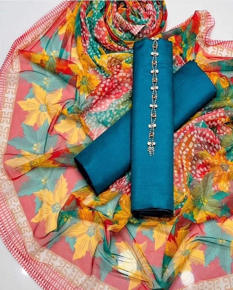 Qattan silk shirt and trouser Neckline Net floral print dupata Suit 4 yards Dupata 2.5 yards