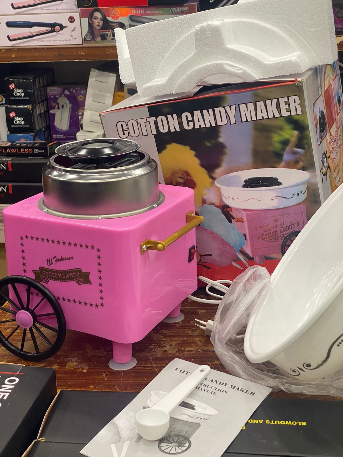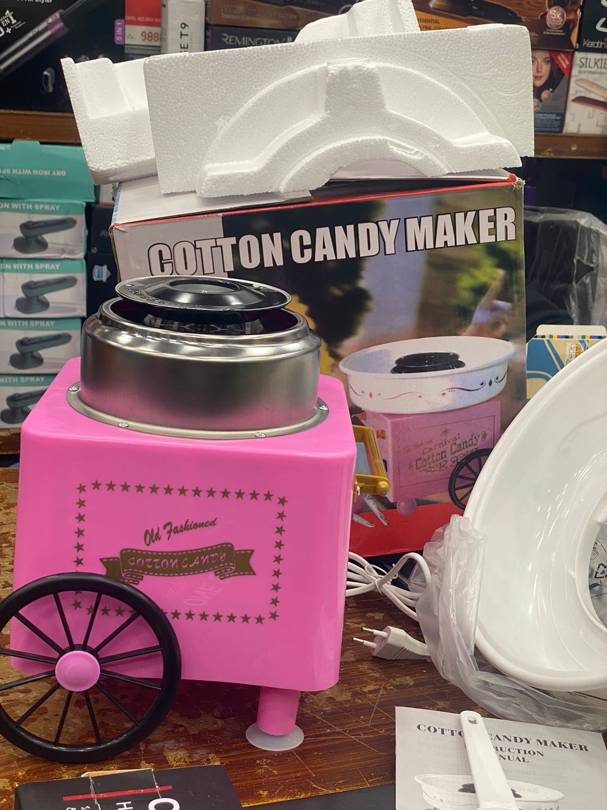- Cotton Candy Maker is a convenient tabletop unit that beautifully resembles the carnival vendor carts of the early 1900s. While designed to look like a nostalgic cart of the past, the Hard and Sugar Free Candy Cotton Candy Maker is in fact a technologically modern appliance. This cotton candy maker will spin both sugar and hard candies into a sweet candy floss, just like at the carnival. The whole family will enjoy the Hard and Sugar Free Candy Cotton Candy Maker. The head extractor and the measuring spoon are along side of the styro-foam inserts.