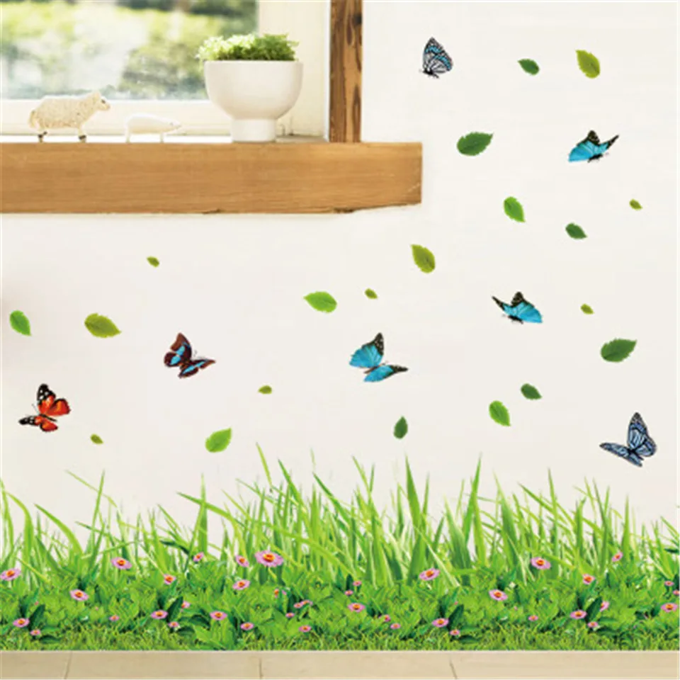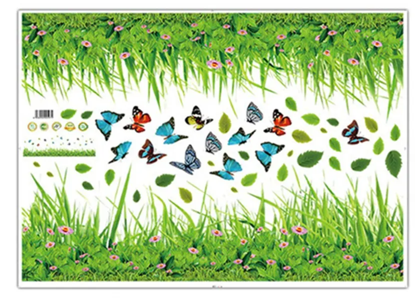 Green Grass Flower Wall Stickers for Kids Room Kindergarten Butterfly Leaves Home Decor Waterproof Mural Self-Adhesive (Random Design)
