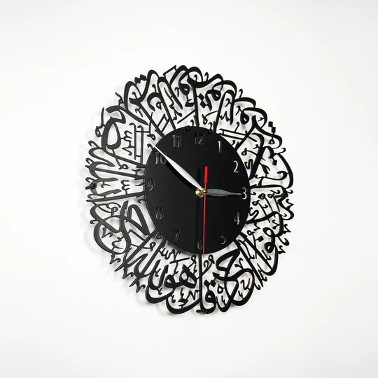 Adorned with the Islamic calligraphy of Surah Al Ikhlas, this striking clock embodies the purity and unity of Allah, offering a timeless statement in Islamic home decor. Ideal as a profound Muslim gift, it enhances any space with its deep message and elegant presence, making it a perfect addition to collections of Islamic art, Islamic wall art, and Quran wall art.