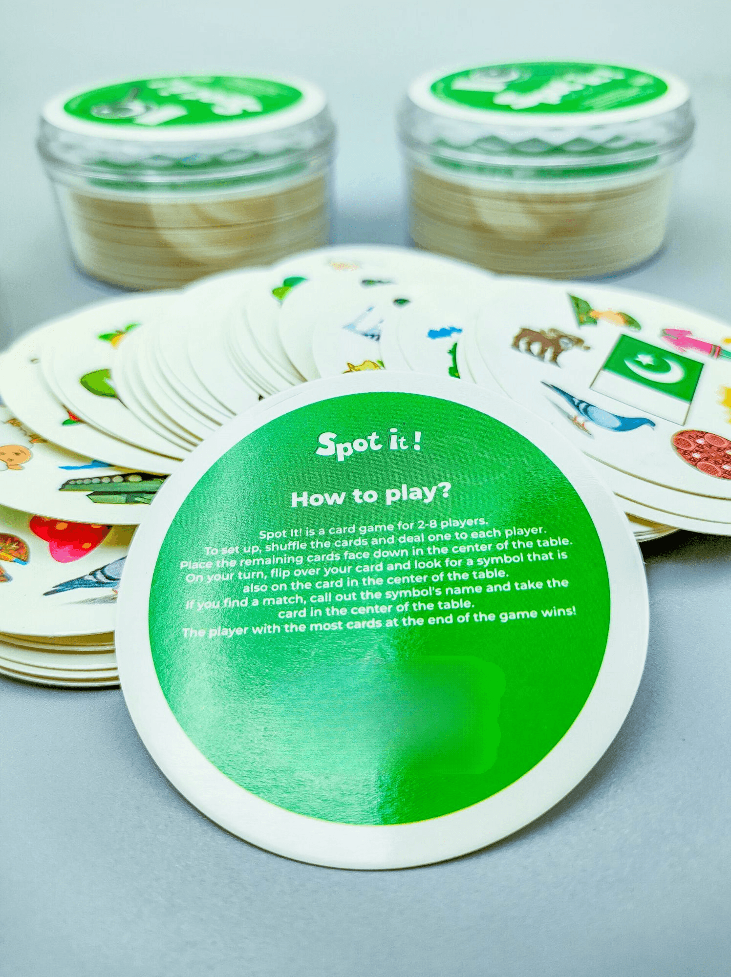 • Each card has exactly one matching symbol or picture in common with the other cards in the deck. Spot it first and you win!