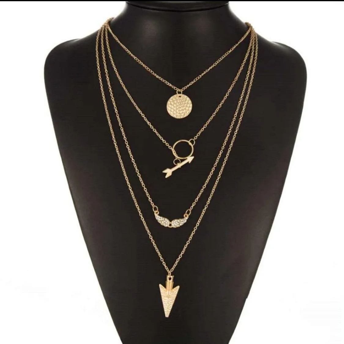 - This necklace is a stunning piece of jewelry that is perfect for any woman. It is made of golden alloy and features a bohemian style design. The necklace has four layers, with each layer consisting of a delicate chain adorned with small arrow pendants.