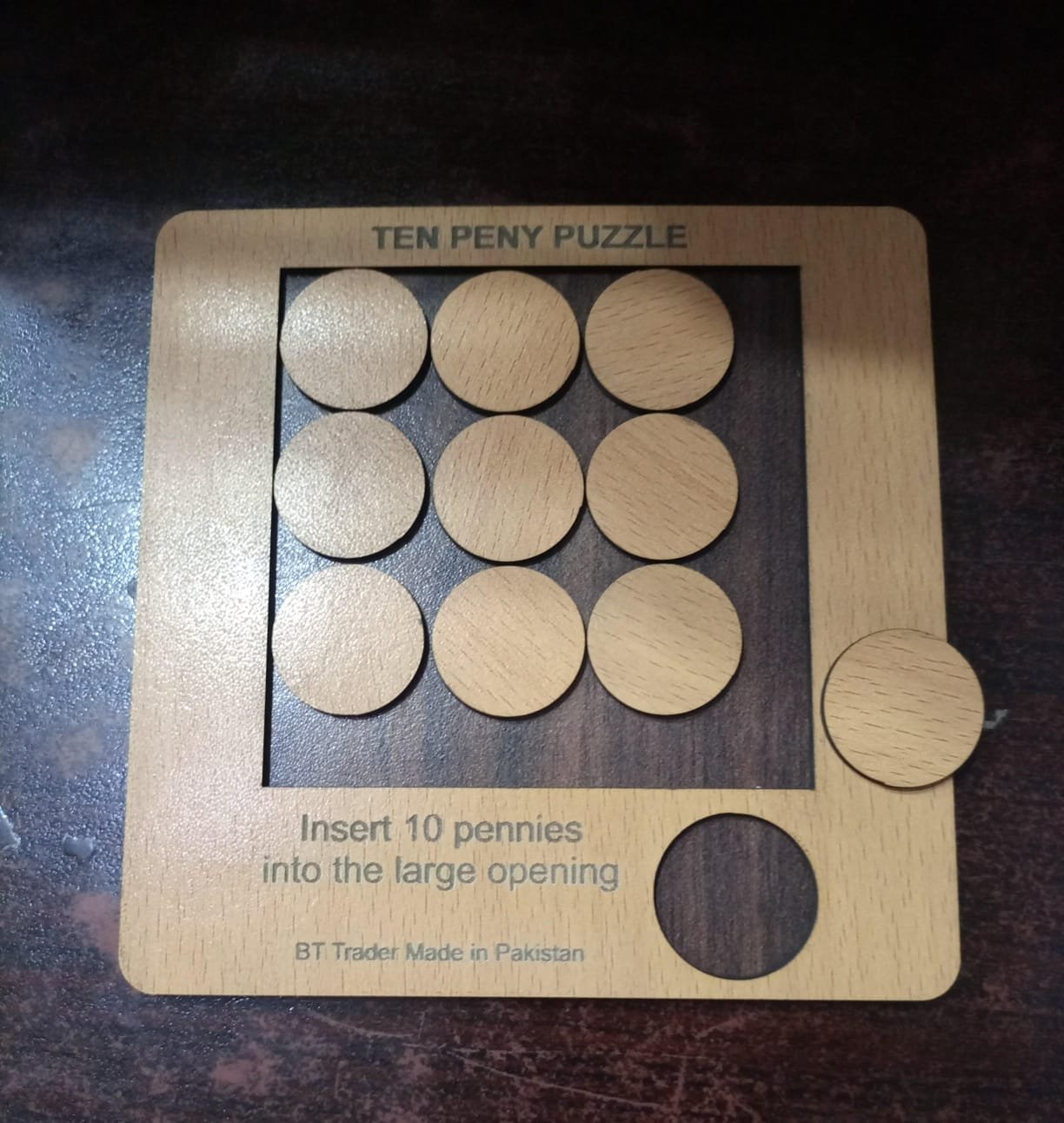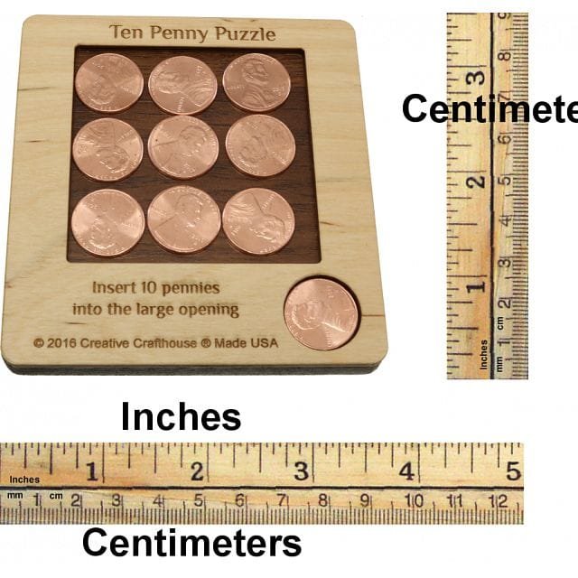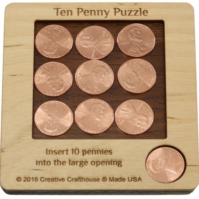 Based on a brain-bending puzzle I saw a few times over the years. Rearrange 10 pennies to fit all ten in the box! Not as easy as it looks.