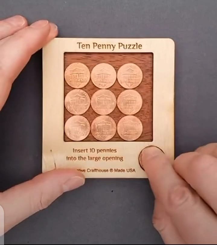 - Insert 10 pennies into the large opening. You’ll be surprised at how tricky this really is.