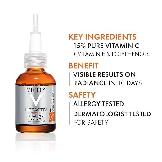 Vitamin C serum that combines 15% Pure Vitamin C and Hyaluronic Acid for brighter and firmer skin in just 10 days. LiftActiv Vitamin C Serum is pure yet potent, with a minimalist formula of only 11 ingredients that is paraben-free and fragrance-free. The perfect addition to your daily anti-aging routine. Creates a visibly brighter and firmer complexion, smooths the appearance of skin texture, and reduces the look of fine lines in just 10 days