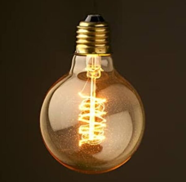 Vintage Edison G95 Spiral Filament Bulb. this reproduction Vintage Edison G95 Spiral Filament Bulb is a medium round style at 80mm diameter, with a spiral filament of around 25mm surrounding a central pillar. This Vintage Edison Spherical spiral filament bulb 80mm has 32 anchor points that lock the fragile filament in position over the life of the globe. With its warm amber glow, an Edison light bulb exudes a rustic charm like no other light bulb. This 80mm diameter globe can be used in any E27 bare pendant or any medium shade style to provide a great effect especially in multi pendant arrangements. It is also a perfect size for fixed lamp holder style fittings.